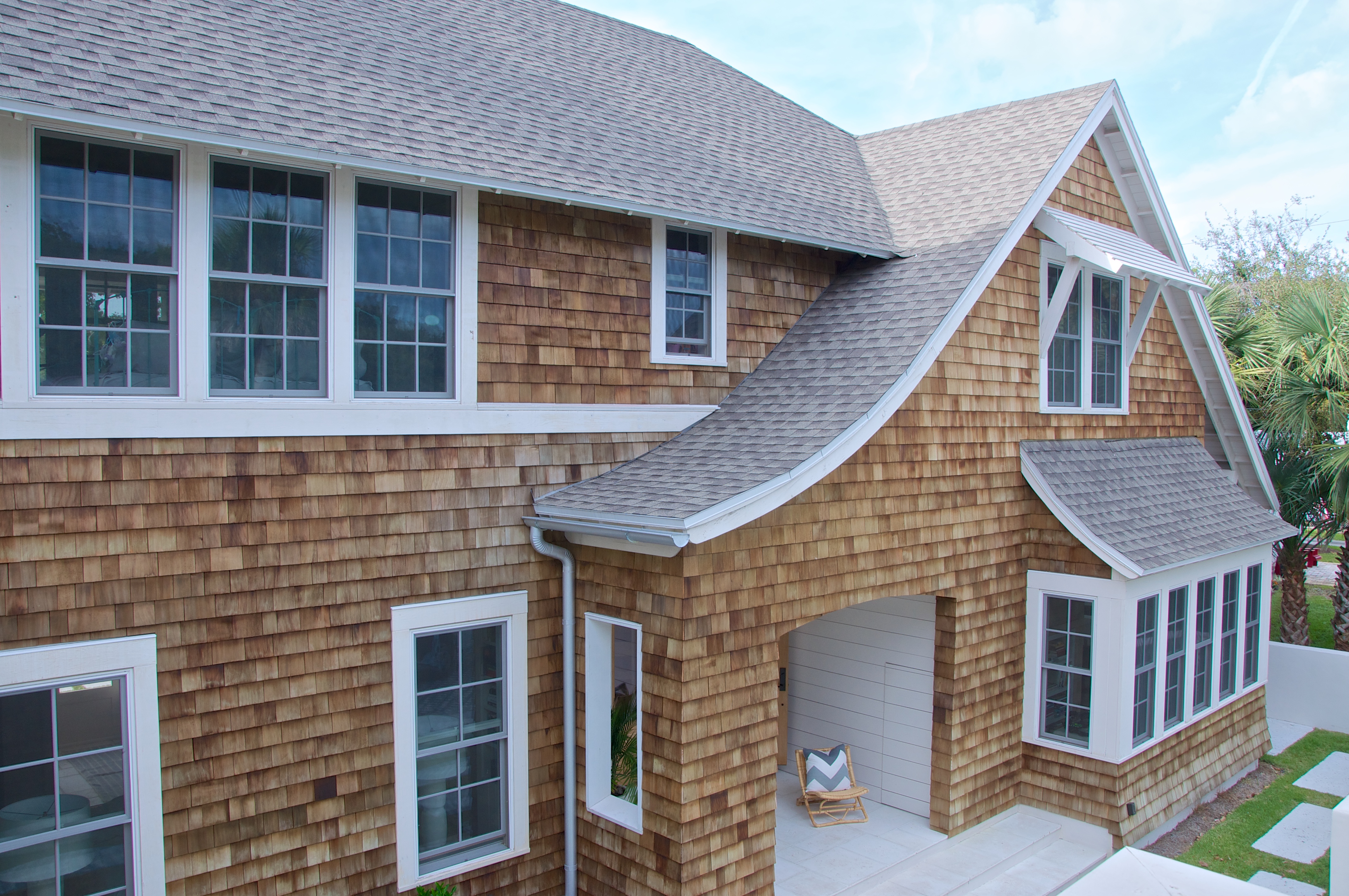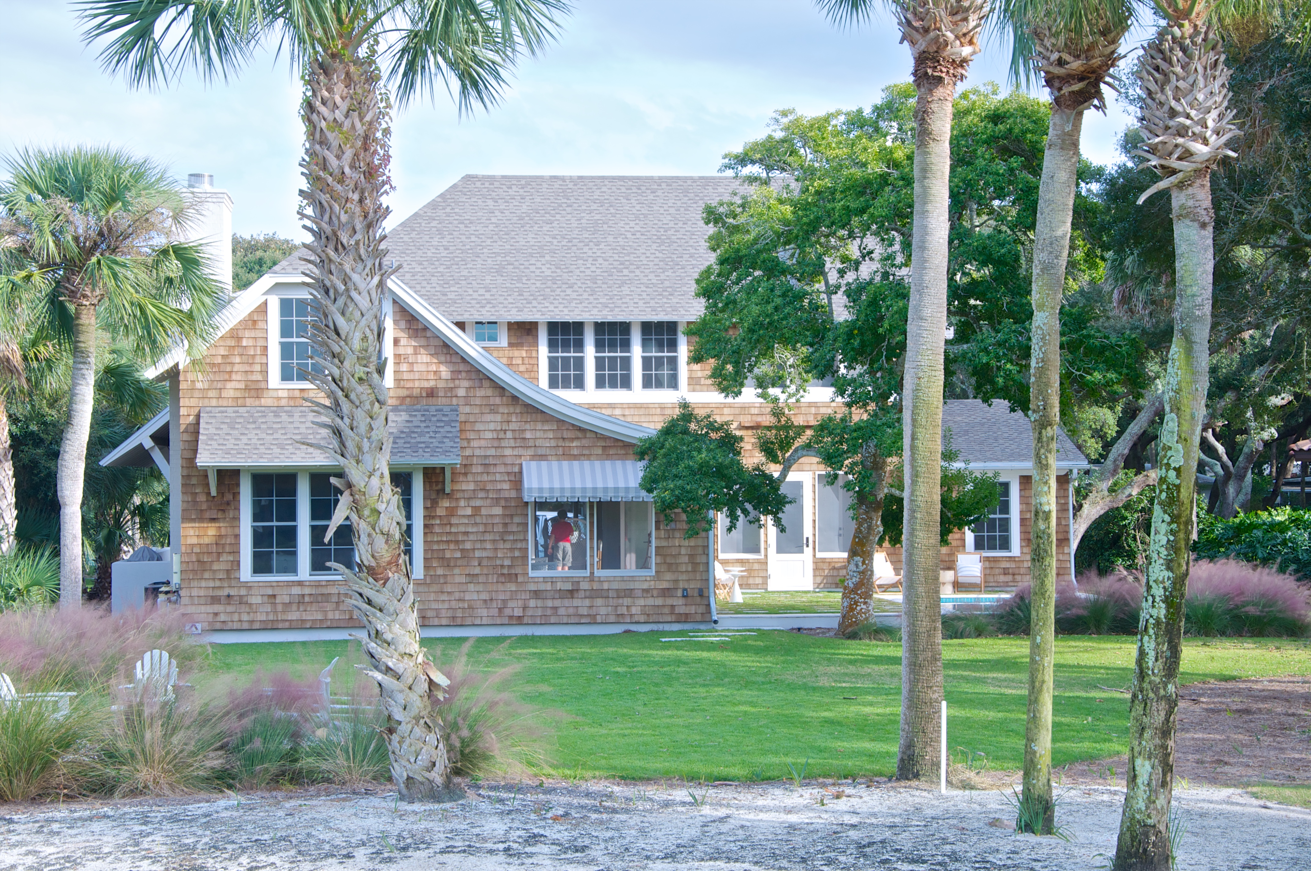 The cedar shingle home’s design is based on a traditional Atlantic seaboard style. Shingles allow one to create curves, which Sanford did—with a dramatic asymmetrical swoosh from the gable to over the front door. The counter-weight drop covers a grilling area and an outdoor shower. It is an indoor-outdoor house, with shiplap, lots of porches, a neutral palette and breathable, mostly wood finishes, impervious to humidity and Floridian temperatures.