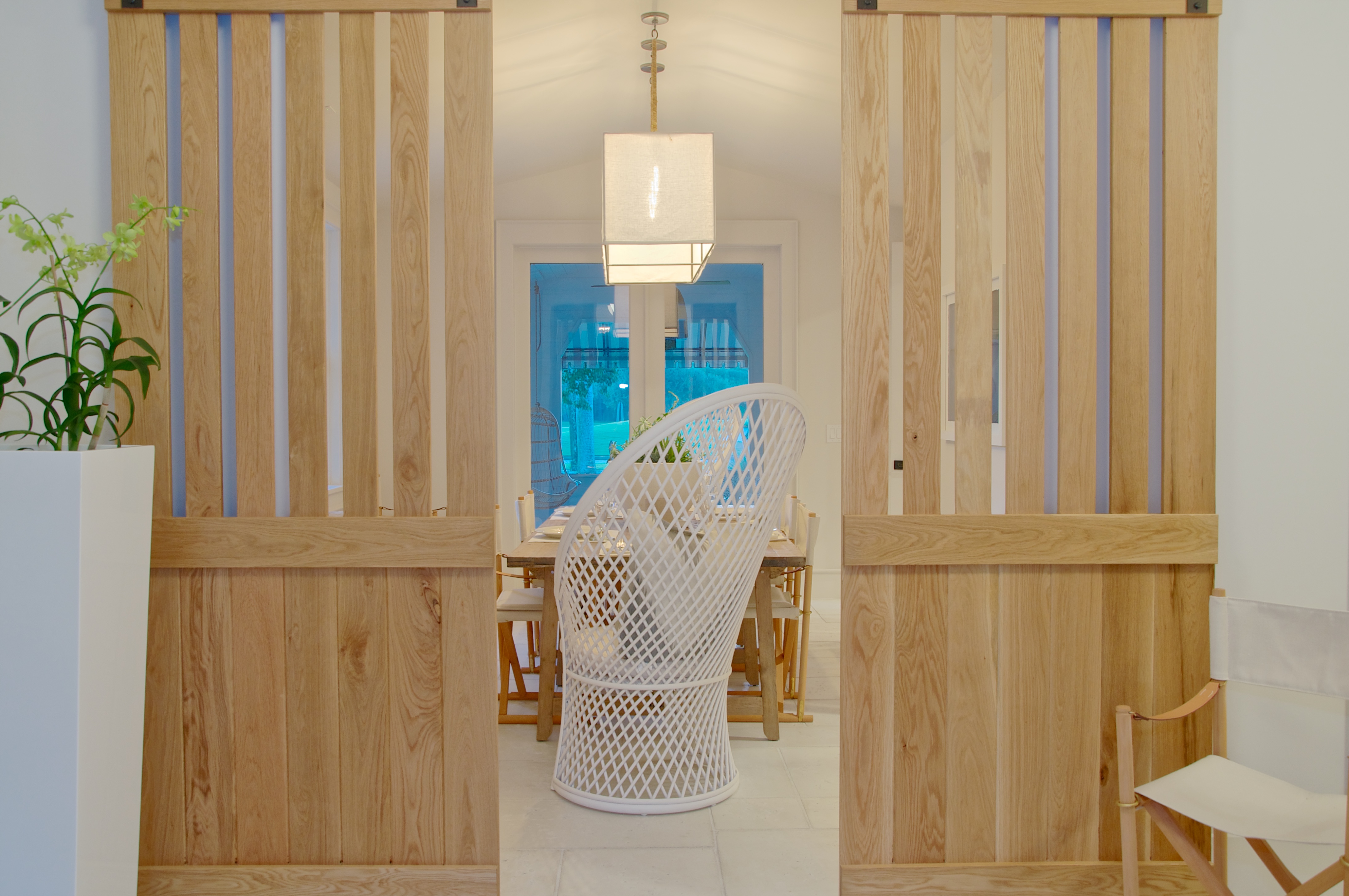 The living room’s walls are an unusual treatment of pecky cypress, where all of the nubbly bits have been filled with spackle. Then a white-wash is rubbed over the top. It’s a contemporary twist on an Old Florida look.