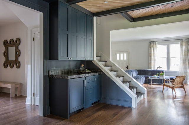 Just one shade lighter—“Midnight Blue”—is the color for what became an exciting transitional space that functions as a library with a built-in bar. “We decided to have some fun with it,” says the homeowner. “We have a lot of books, and needed a place to put them.” She had seen a diagonal bookshelf and thought the look was a fun way to add a sculptural element. Poplar planking added to the ceiling offers an eye-catching way to extend the book-nook, linking the adjacent bar and storage areas.