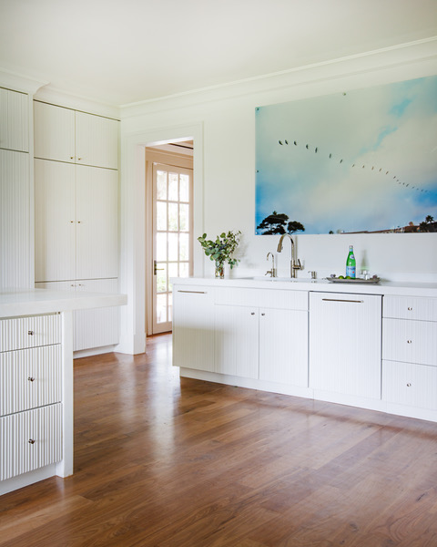 Though the homeowners sought a “quiet, minimal” look, that can be a challenge when designing for a family of four—one with phones, chargers, backpacks, sunglasses, and the like. Rather than install cubbies to store their many accessories, this family opted for floor-to-ceiling cupboards, with doors framed in ever-decreasing rectangles. “It’s a little gesture that resonates as Art Deco [the era the house was built in] but sustains the neoteric flavor of the home’s overall design,” Jarvis notes.