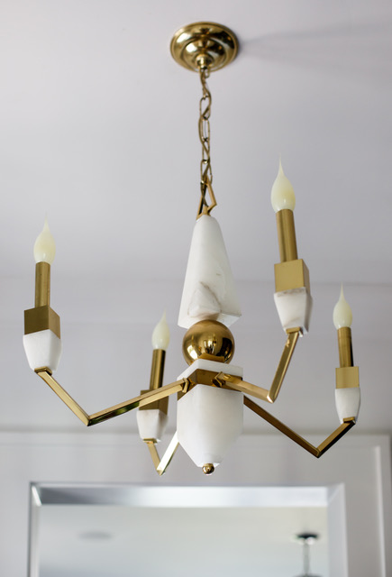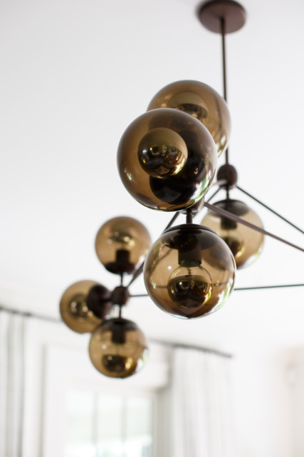 A back hallway provides a discrete entrance to an expanded powder room. The homeowner wanted “wallpaper with movement” for the enclosed space, where she and Jarvis already knew they would make use of vintage lighting. Jarvis had just the thing: pen and ink drawings of clouds resembling vintage newspaper illustrations (fitting, considering the homeowner takes photos of clouds). The powder room’s chunky icicle sconces came from an expedition hunting through old boxes of vintage lighting, and reassembling the pieces. A coordinating chandelier and leather pulls on blue-black cabinets add further texture to the intriguing private space.