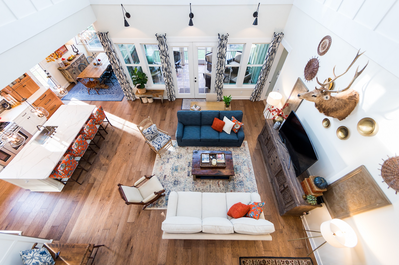 When adding patterns or pops of color to a house it’s important to maintain balance. A good rule of thumb is to keep color schemes relatively simple with patterns that contain the same color or the complementary colors. For example, if you have a blue couch, adding accents of orange throw pillows, chairs or an orange patterned rug can really make a room pop. Alison and Chris Sieburg, with the help of Shawn Starr Custom Homes, created the perfect mix of color and pattern for their modern farmhouse, as seen above.