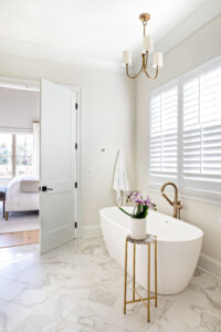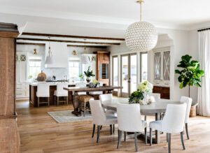 The kitchen includes coastal-inspired elements such as quartz countertops, gold hardware and light fixtures, a Venetian plaster hood and a hand-molded backsplash. The oversized island is the perfect space to gather. It’s made of walnut cabinetry and is mere steps away from the outdoor patio, providing an abundance of natural light. “The kitchen is my favorite room in the house,” Jeannie says. “With plenty of seating and room for friends and family, the space was made to entertain.”