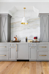 The wet bar allows for extra space to entertain and unwind, complete with a wine refrigerator, two refrigerated drawers, soft grey cabinetry and a backsplash crafted