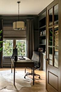 The office doors are crafted from white oak and dry brushed to match the home’s reclaimed beams, while the striking black walls provide an incredible contrast to the rest of the house. “The office was a special project to work on because we got to collaborate alongside the homeowners to craft the perfect space,” says Norris. “We wanted to create something masculine and bold that would work cohesively with the home.”