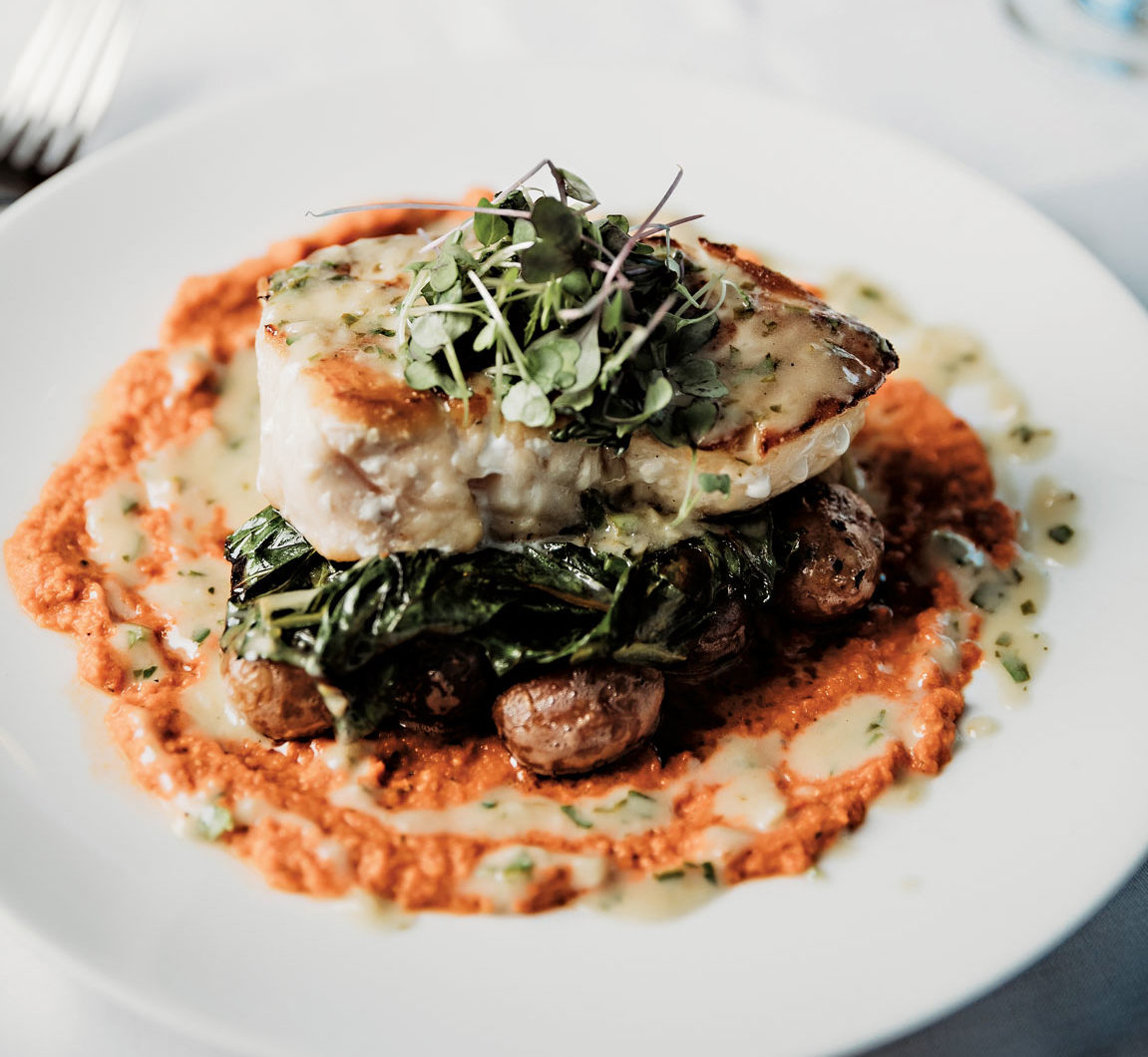 √ Chicken Francaise with roasted peppers, potatoes, spinach, and lemon cream sauce, $23