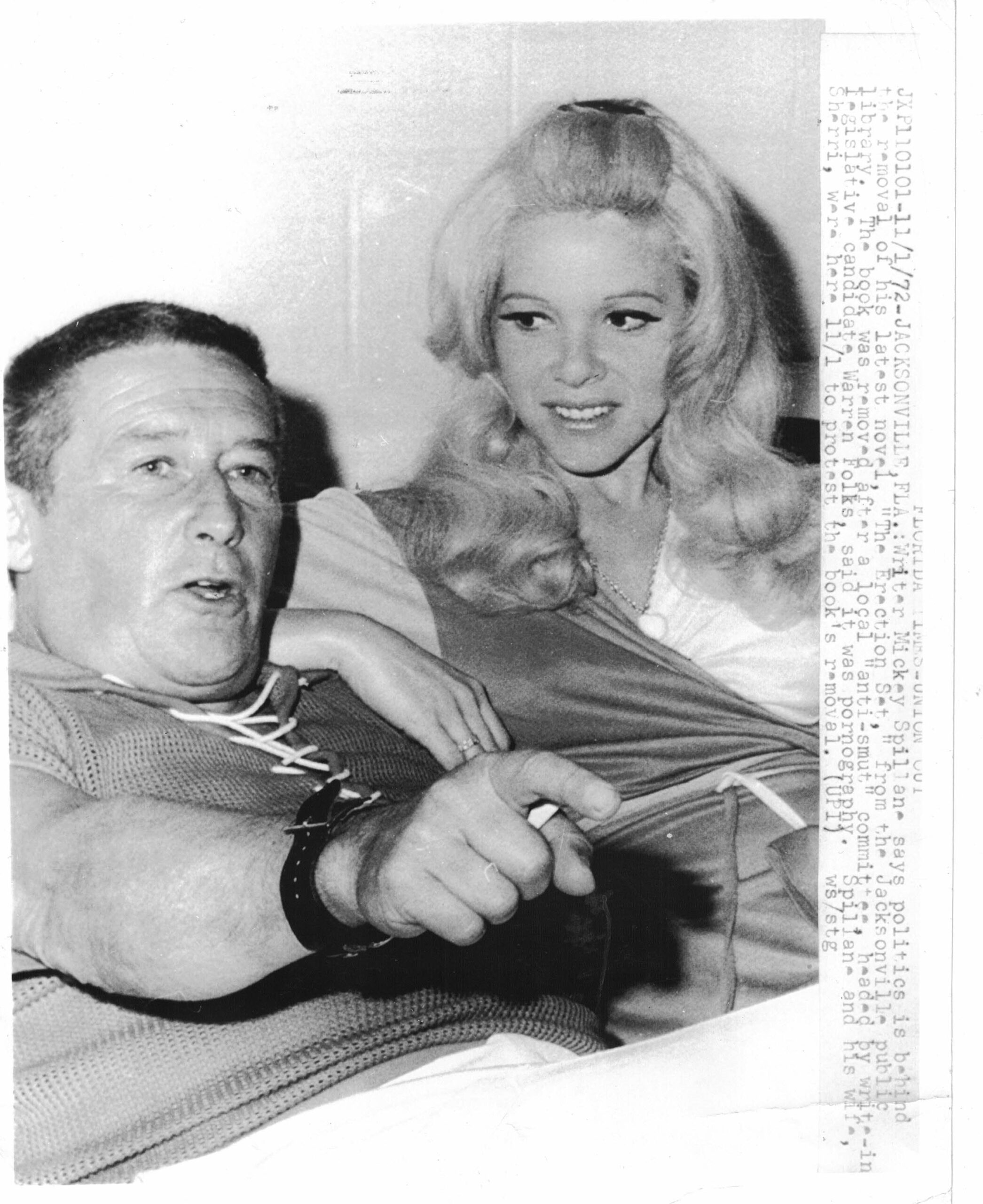 The cover of Mickey Spillane’s 1972 novel The Erection Set featured his wife Sherri from the side, posing nude, one leg in the air. Spillane did anything he could to burnish his image as a tough guy who wrote tough books, crime novels featuring the rogue detective Mike Hammer. Hammer brawled and talked smack and chased skirts. Spillane was 46 when he married the 23-year-old night club singer Sherri Malinou. Mickey didn’t mind when fans confused him with Mike.